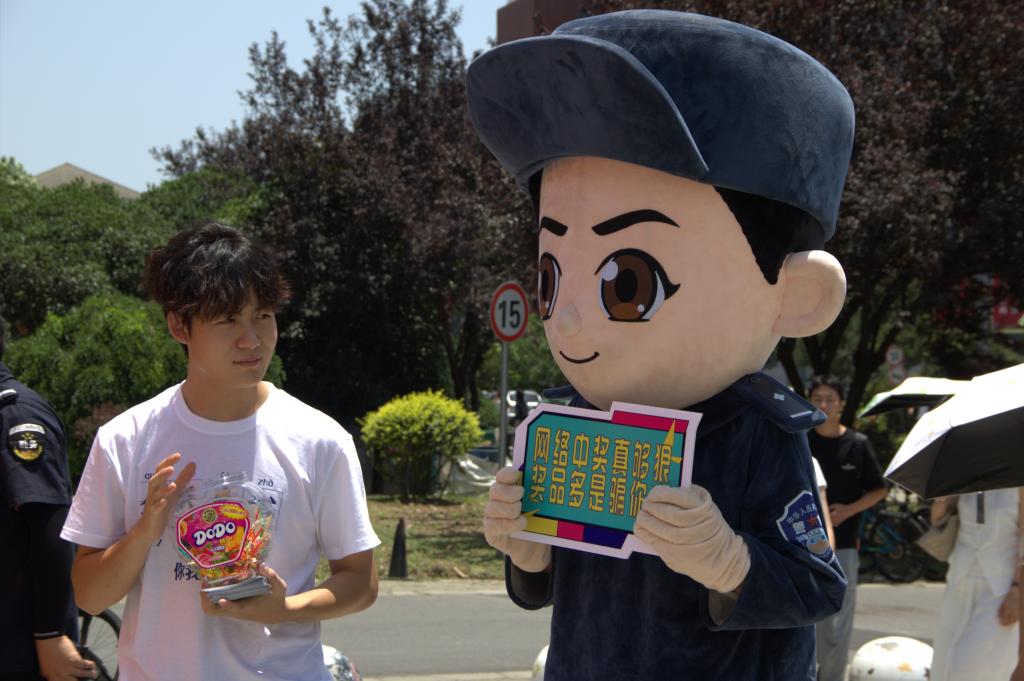 活动现场还设置了“安全宣传单页发放点”,大学生护校队向过往师生发放宣传资料,并耐心讲解安全常识。为提升宣传活动的趣味性,还特别安排了“安全宣传玩偶”在活动现场与师生互动,发放宣传单页,吸引众多师生拍照打卡,营造了浓厚的校园安全文化氛围。