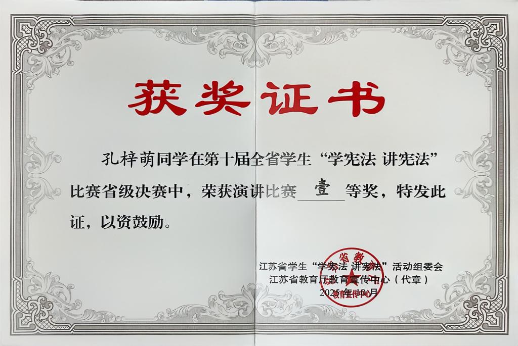 我校学生荣获江苏省第十届学生“学宪法 讲宪法”比赛一等奖