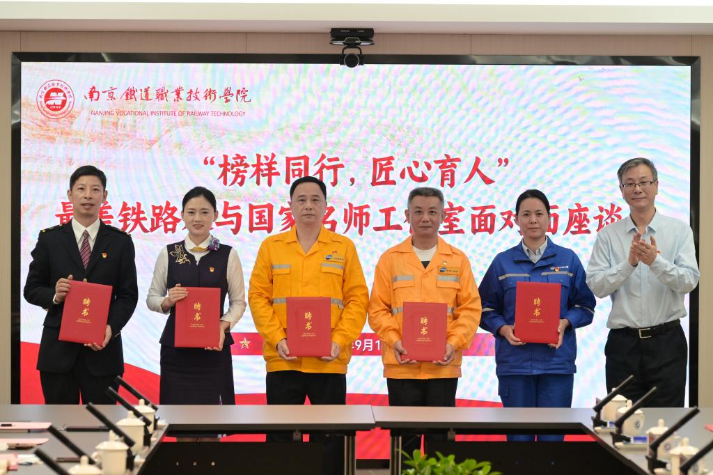 匠心相汇,同启美美与共、携手育人崭新篇章。报告会后,我校组织名师工作室团队与报告团进行主题为“榜样同行,匠心育人”的座谈会。会上,学校副校长赵婧向报告团介绍了学校名师工作室建设发展情况,党委书记贺兴初向报告团成员颁发导师聘书,双方围绕会议主题进行了交流。会后,名师工作室团队成员陪同“最美铁路人”报告团成员参观江苏铁路教育馆,共同回顾和感受百年江苏铁路发展史上的峥嵘岁月和动人故事。